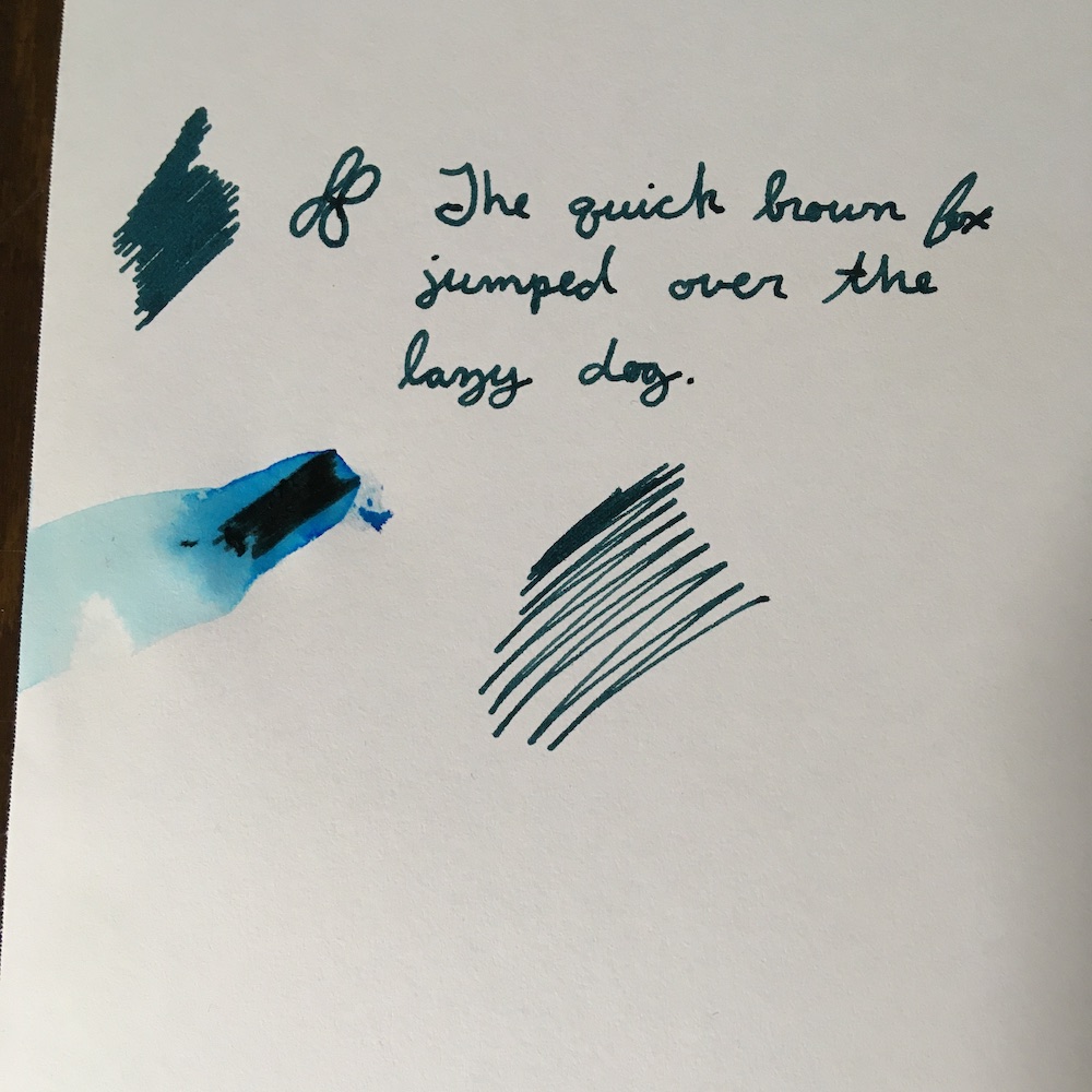 I have been writing with Noodler’s Aircorp Blue Black for almost a year now, and I love it. Blue black is really kind of a lie; the colored element of Aircorp is more green or teal. It leaves a wonderful impression. In the wrong light, it can be so dark that you just feel the hint of color, tickling the back of your brain as you try to nail it down. In better light or larger swatches, the color is beautiful without being overpowering. When you wet it, a good deal of blue does bleed out, so it must be an element in there somewhere.