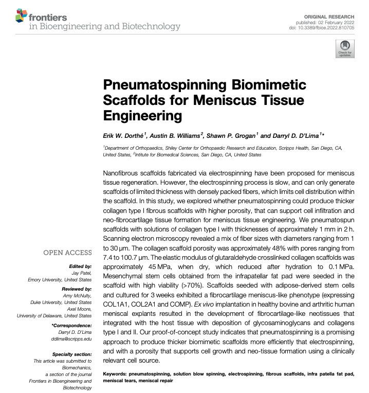 I had just explored some basic experiments in solution blow spinning (SBS) when our lab had an invitation to submit to a special issue of Frontiers in Bioengineering and Biotechnology related to meniscus repair. We applied some of what I had done and came up with this paper. This is the first time I have been first author in a long time, although it was a real team effort and I am pleased to have had such a good group to work on it with. The paper is available via open access if you want to read more.
